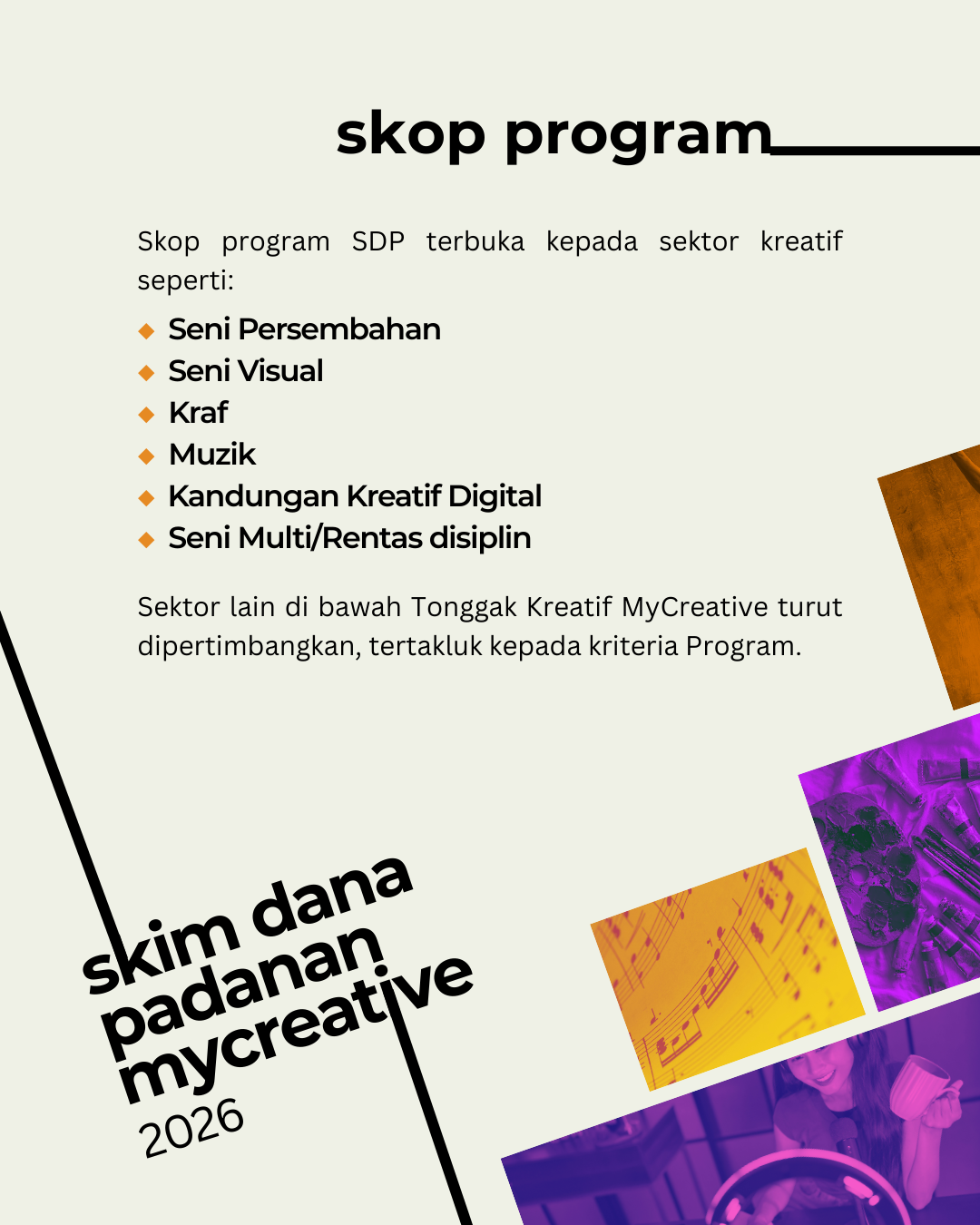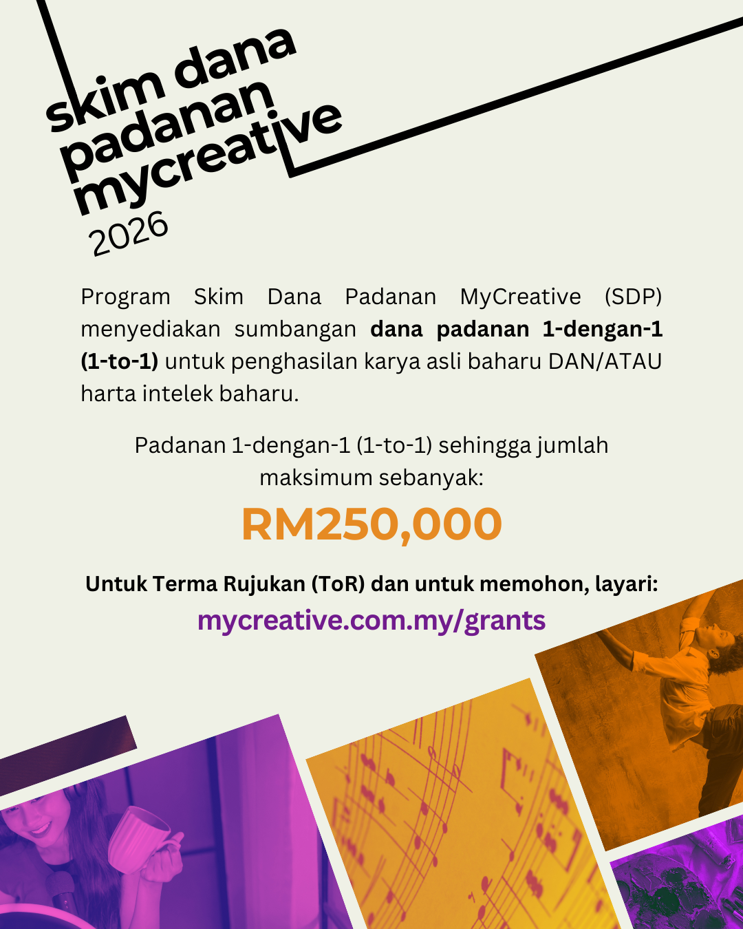 Program ini menyediakan geran padanan 1-dengan-1 (1-to-1) sehingga jumlah maksimum RM250,000 bagi dana tunai (cash funds) yang diperoleh bagi pembiayaan projek-projek kreatif oleh entiti berdaftar dalam sektor kreatif Malaysia, dengan fokus kepada sektor-sektor (namun tidak terhad kepada) yang berikut: seni persembahan, seni visual, penggiatan semula kraf, muzik, kandungan kreatif digital, dan seni multidisiplin atau merentas disiplin. Permohonan di bawah sektor-sektor kreatif lain yang termasuk dalam senarai tonggak kreatif MyCreative boleh dipertimbangkan sekiranya memenuhi kriteria dan tujuan asal Program.